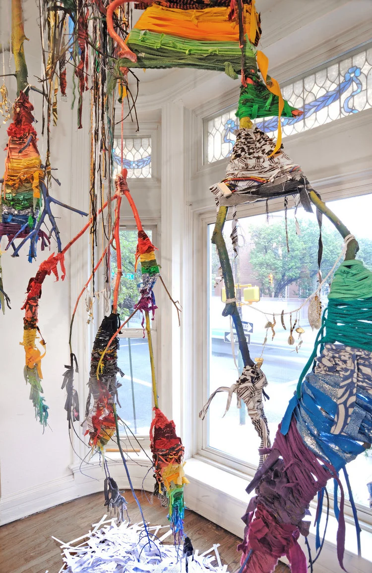Above All You Must Not Play At God, Woven Fabric on Branches Installation, Detail, 2016, Galerie Myrtis, Baltimore, MD