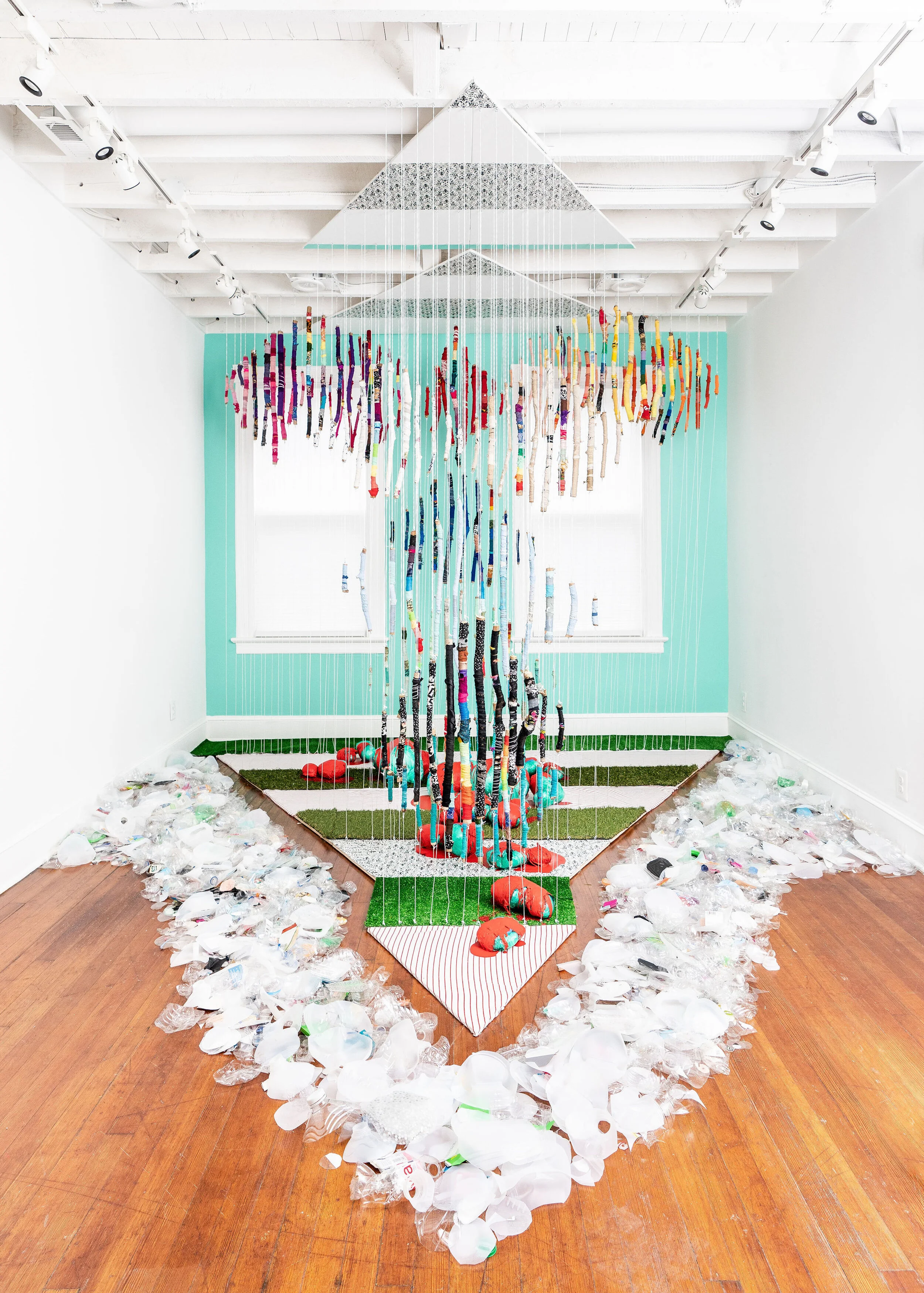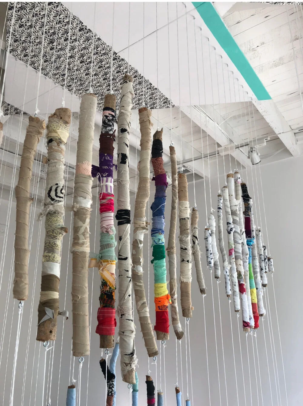 The installation consists of fabric-wrapped talking sticks, hung from the ceiling by nylon roping and attached to a triangular-shaped wooden substrate. The talking sticks—used by indigenous cultures to designate the authority to speak within a group, to promote democracy and encourage dialogue—are used in this installation to represent the double helix of a DNA strand. They are referencing the damage and injury to the DNA that shows up in the female reproductive organs. The formation of talking sticks symbolizes an abstracted representation of a uterus.