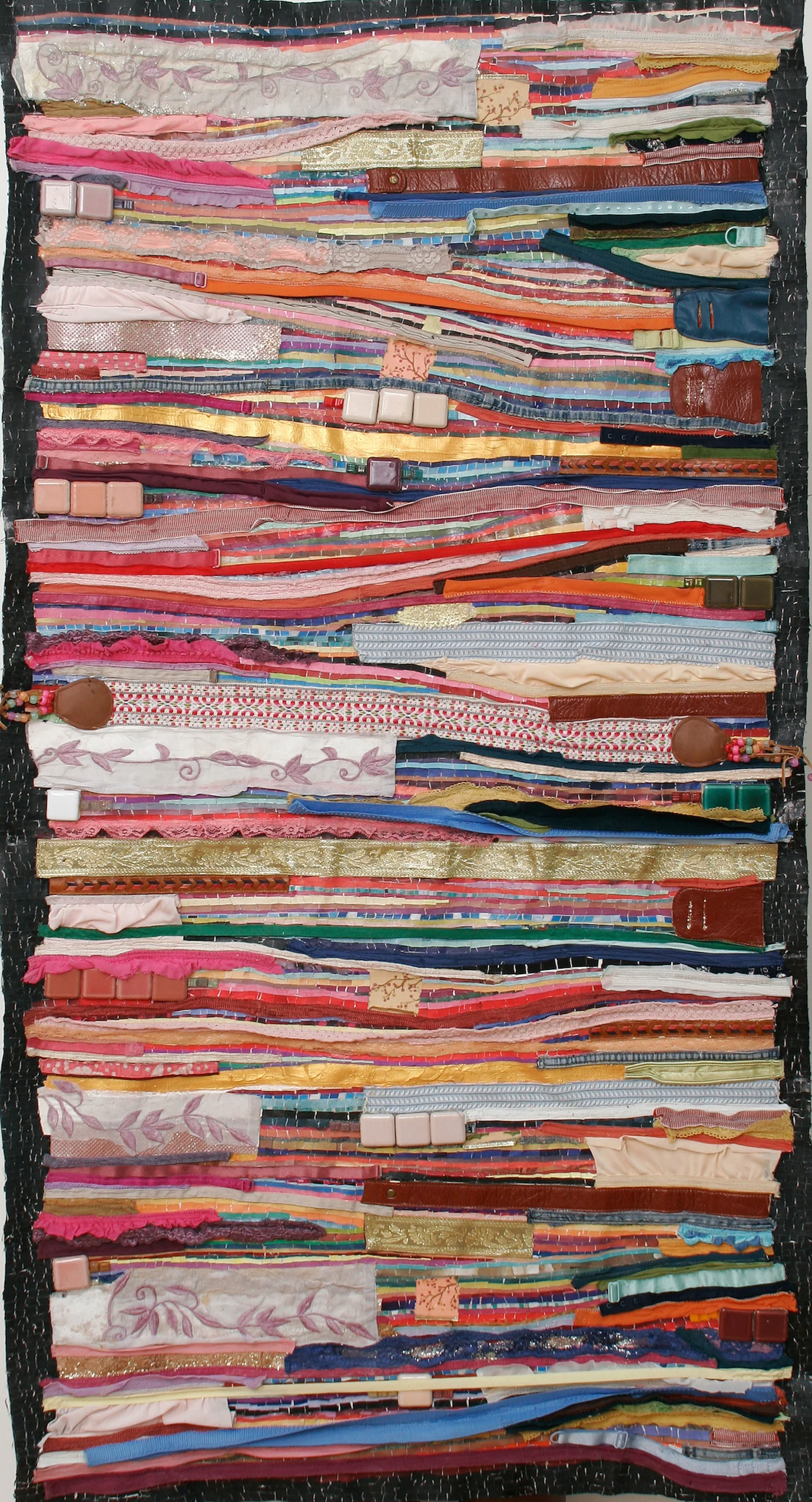 Each work is 31 in. x 60 in. and are composed of a mixture of sewn, collaged, and/or adhered feminine materials and found objects. I began these pieces by either creating a smaller sample or by having an overall concept of the composition, and use of the spatial planes. I strategically focus on the placement of each color, and the size, and texture of each piece of material or object to create a sense of pattern, and rhythm. Through this series, I attempt to preserve memories and time by using recycled objects to create art that incorporates items that once had specific meaning for others and myself. Many of the materials are from my own personal use or purchased from thrift stores. I am fascinated by what people initially become attached to, and how these same “things” are later tossed aside when they are deemed useless or unnecessary. Each of the works, took a year to complete and focus on a specific aspect of the healing power within myself, and to draw attention to the act of creating, as a process of recycling, regenerating, and rebuilding.