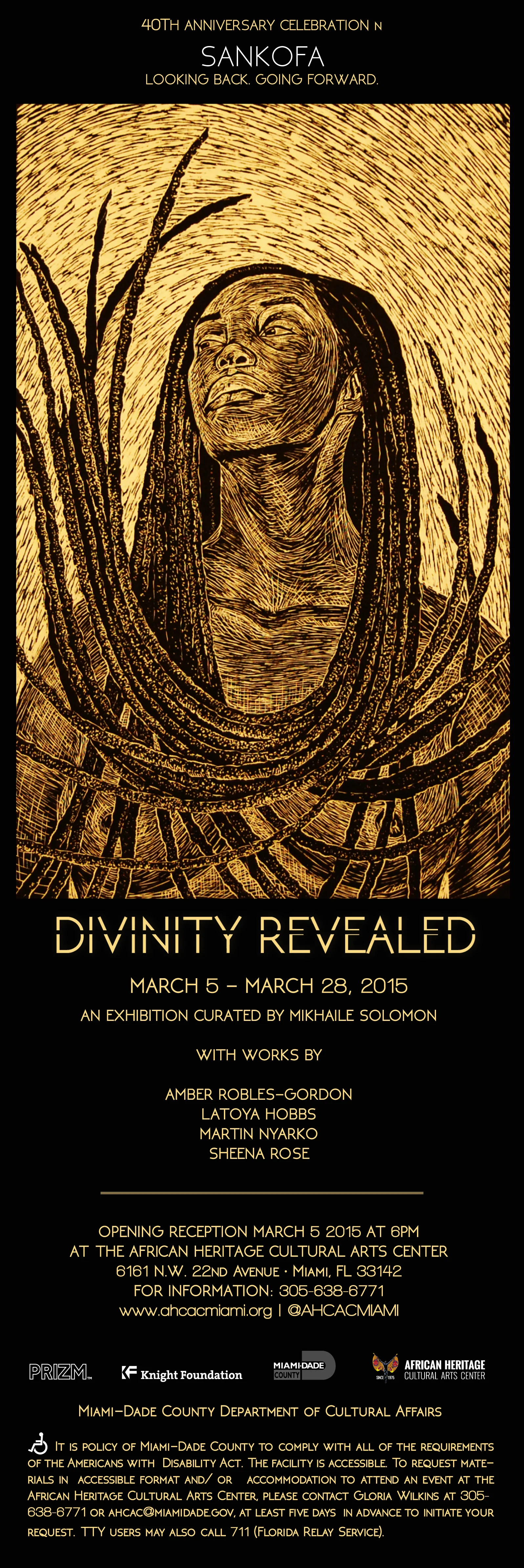 Divinity Revealed Amadlozi Gallery Exhibition, March 5–30, 2015: Curated by Mikhaile Solomon, Divinity Revealed premieres work by national artists, LaToya Hobbs, Sheena Rose, Martin Nyarko, and Amber Robles-Gordon.