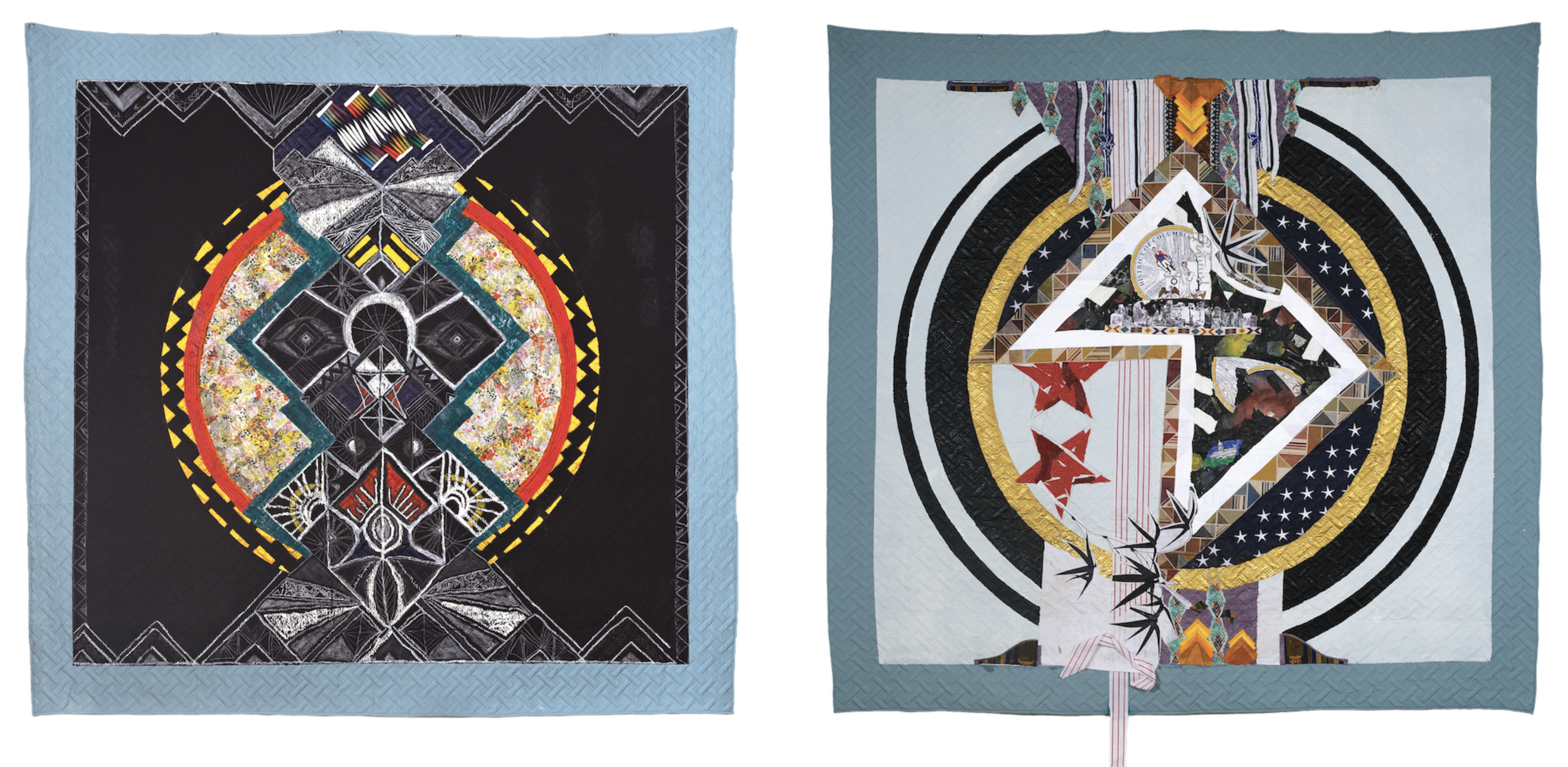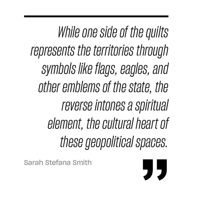 Place of Breath and Birth bears the mark of one of the United States empire’s territories, Puerto Rico, referencing the artist’s personal relationship to its people, land, and culture. Successions take a more hemispheric approach. This series comprises double-sided quilts standing in for five territories of the U.S. empire—Puerto Rico, Guam, U.S. Virgin Islands, American Samoa, Northern Mariana Islands—and the District of Columbia, a federal district. While one side of the quilts represents the territories through symbols like flags, eagles, and other emblems of the state, the reverse intones a spiritual element, the cultural heart of these geopolitical spaces. This second orientation to the quilts, which are suspended from the gallery ceiling like flags in a federal building’s rotunda, upends a logic of conquest by inviting viewers to encounter them through another path.