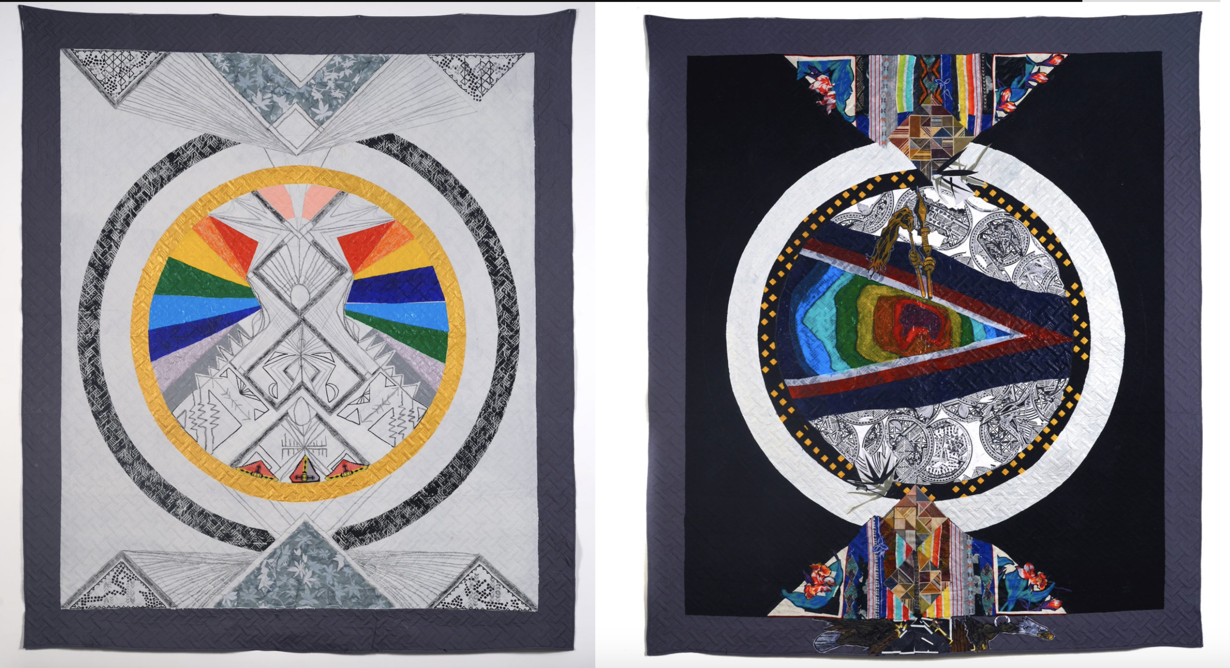 The sixth quilt, the first completed in the series, titled “When All is Well (Front)” stands out with its color palette of red, green, and sunburst orange against a black background. With paint and fabric stitched together, the quilt holds symbology of flora, fauna, and deconstructed text that contrasts with a pattern of white geometric lines and marks. From the quilt’s outer reaches comes a cascading element of green and brown lines and curves and triangular patchwork, and a pink-and-yellow bloom disrupts the earthen tones. A circular area with symmetrical marks, resembling eyes, is composed alongside what might be a talisman hanging in sunburst orange. “When All is Well/The Hawk (Back)” continues motifs of flora and fauna, alongside a black background where line and mark bring together symbols reflecting latent and less obvious cultural and social inflections of being.