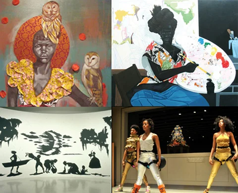 above images, clockwise from left: Jamea Richmond-Edwards, I am Here (detail), 2009, Ink, acrylic, graphite and collaged paper on canvas; Kerry James Marshall, Untitled (detail), 2009, Acrylic on PVC; Holly Bass, African Futures: DC, 2010, Photo documentation of live performance, photo by Rosina Photography; Kara Walker, Slavery! Slavery! Presenting a GRAND and LIFELIKE Panoramic... (detail), 1997, Cut paper and adhesive on wall