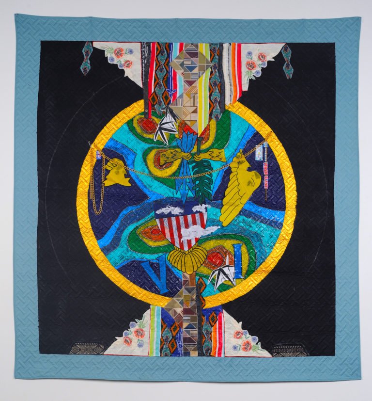 “USVI Spiritual, Moko Jumbie: Walk Tall and Heal Forward” Mixed Media on quilt, (back of “USVI Political”) 2021 (Courtesy of Amber Robles-Gordon)