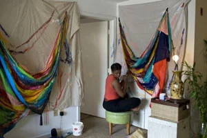 Amber Robles-Gordon works in the living room of her Anacostia home. Gordon earned an Master of Fine Arts degree from Howard University.