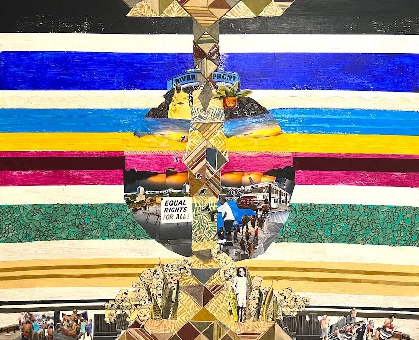 What We Are Owed: Reparations and Restoration, mixed media on wood panel, 40 x 48 in., 2023