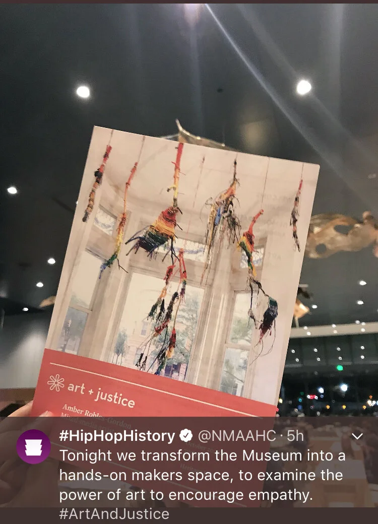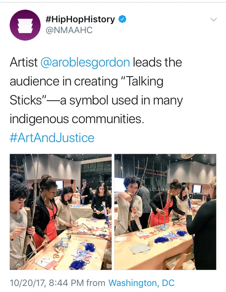 This program amplifies an important pillar of the National Museum of African American History and Culture’s mission to explore and share how American values such as resilience, optimism, and agency are reflected in the African American community’s past, present, and future. art + justice embraces the therapeutic power of creativity to improve well-being, increase positive emotions and endorphins, and invigorate restorative energy towards personal and social peace and wellness. Artist + Art Project: Washington, DC textile and mixed media artist, Amber Robles-Gordon leads a beginner’s-level art lesson creating “Talking Sticks” – a symbol used in many indigenous cultures to designate the authority to speak within a group setting. This symbolic art-making lesson reflects on the long history of community activism with the African American community and beyond and encourages dialogue while providing space for personal reflection and introspection.