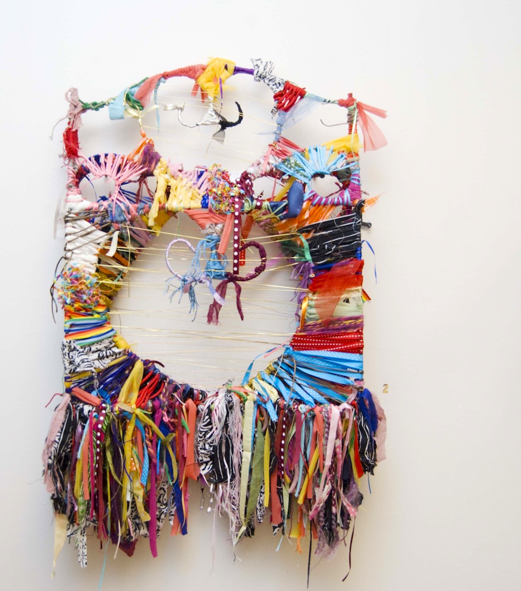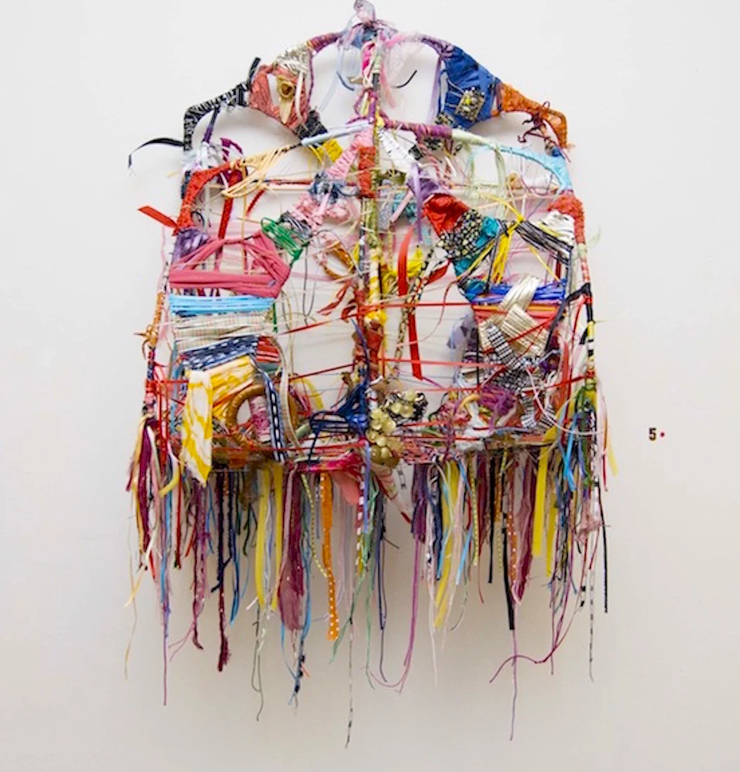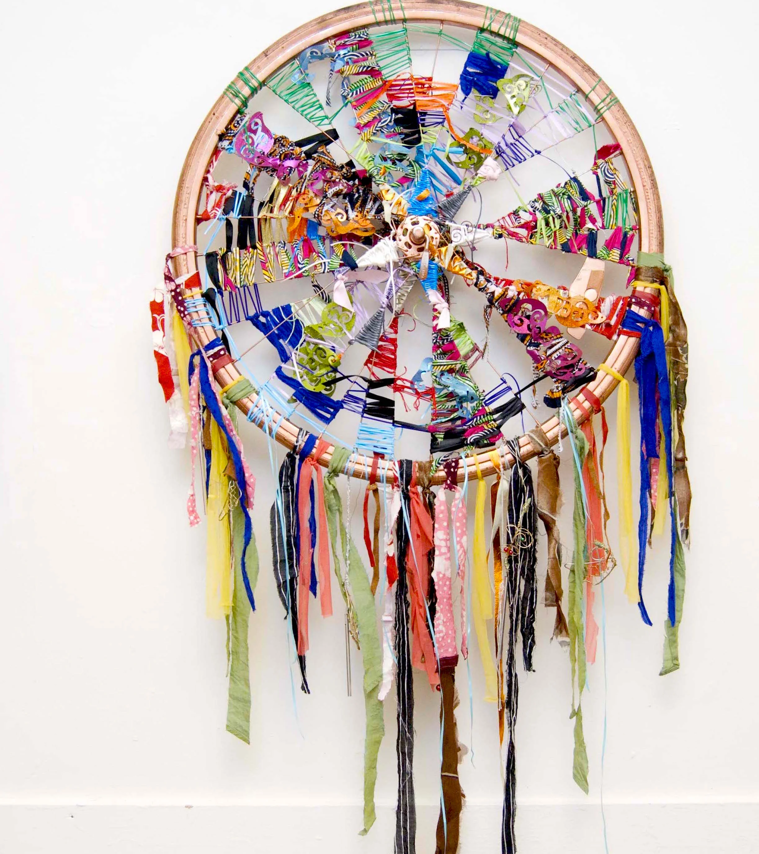 I aim to visually convey these specific social dynamics by symbolically weaving the colored materials and items through the metal forms. This is done as an attempt to visually transcend the implied social boundaries that the fences and grids represent. Conversely, I use these metal items as bases because they’re elementally sound and solid. Additionally, some of the works also have chicken wire arranged around the base metal object then the entire form has to be molded into a desired shape. Overall, my intention is to create works that attempt to visually parallel the social and gender inequalities that are manifested in our world due to the imbalances of feminine and masculine energies.