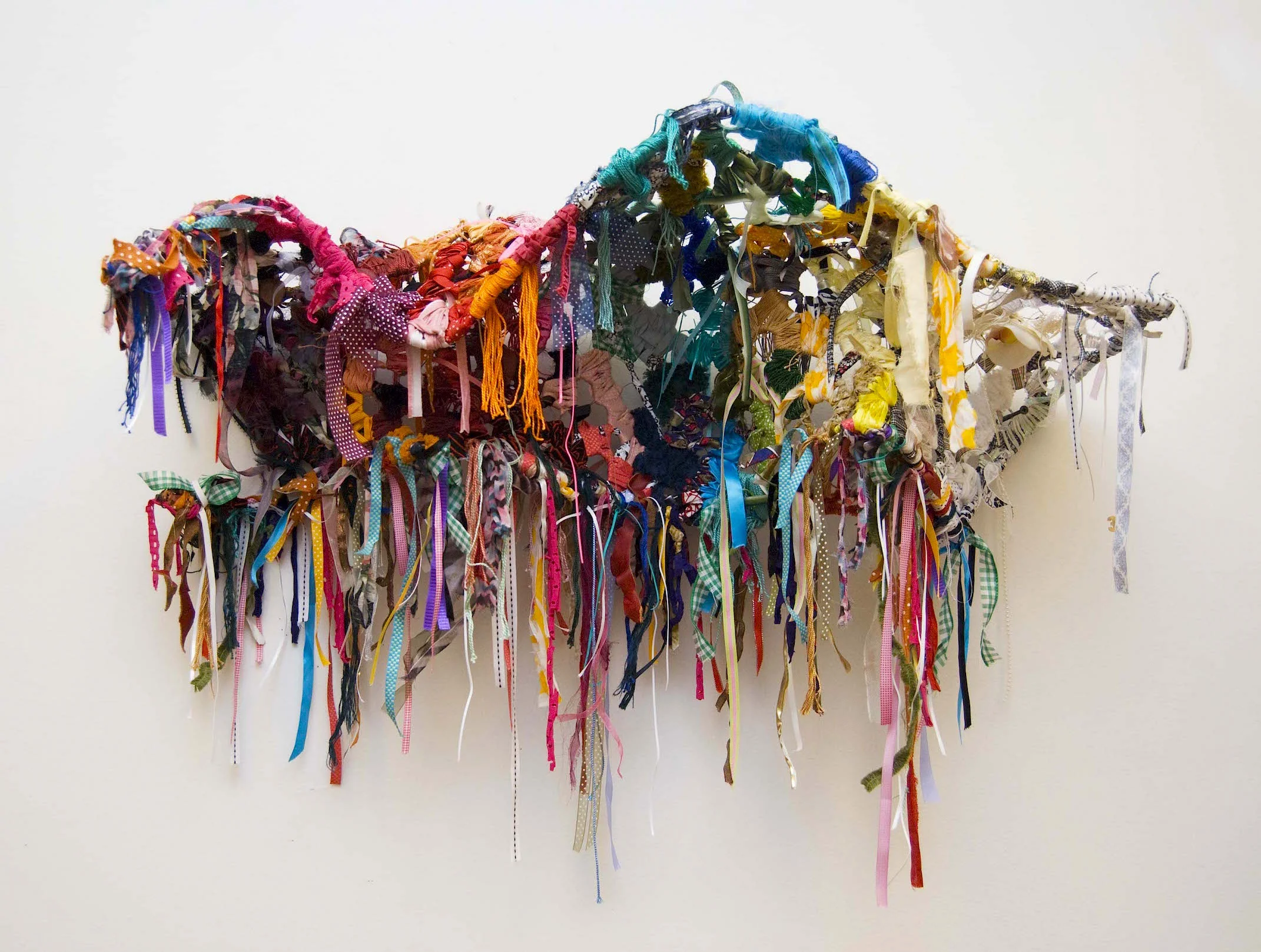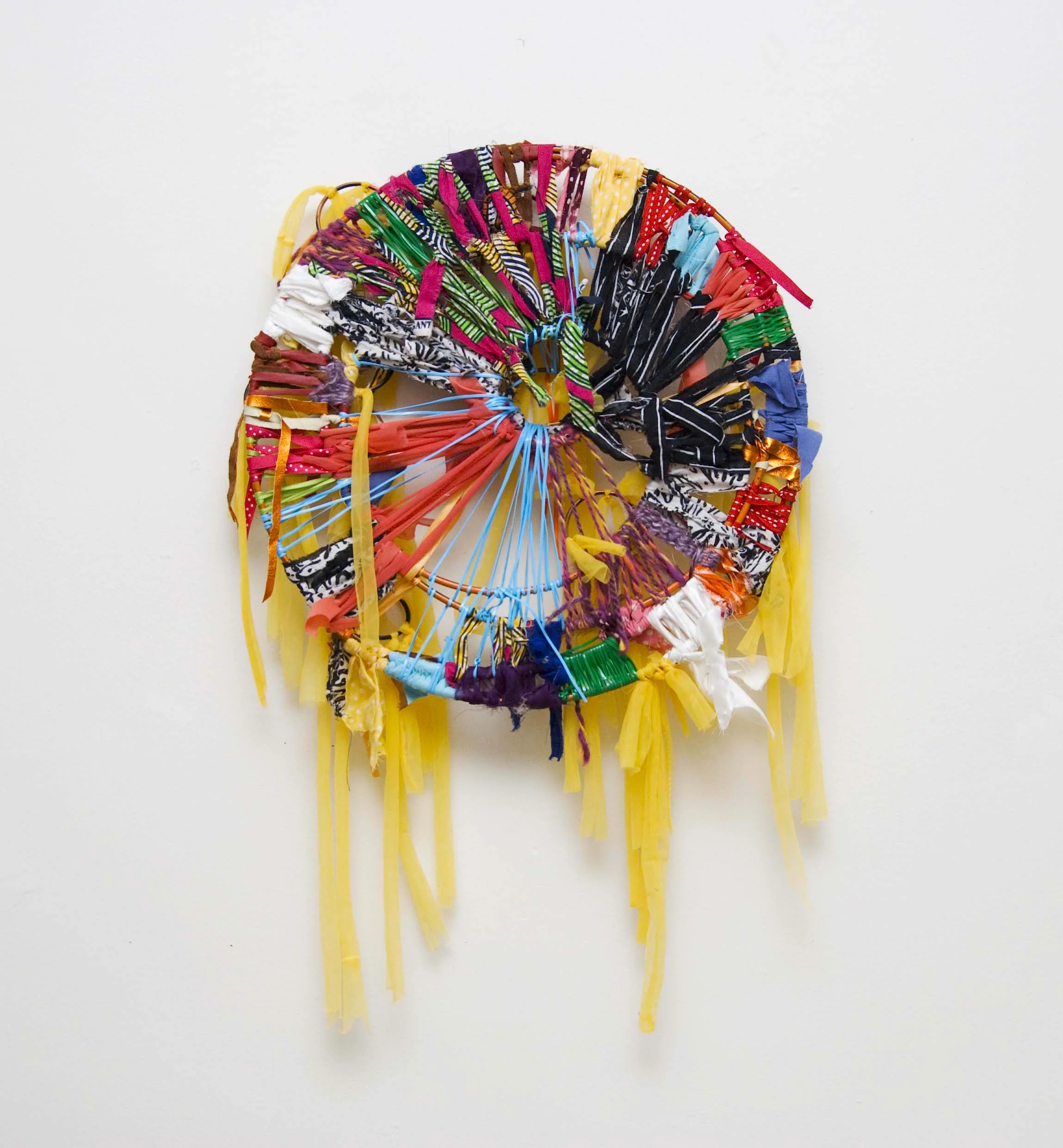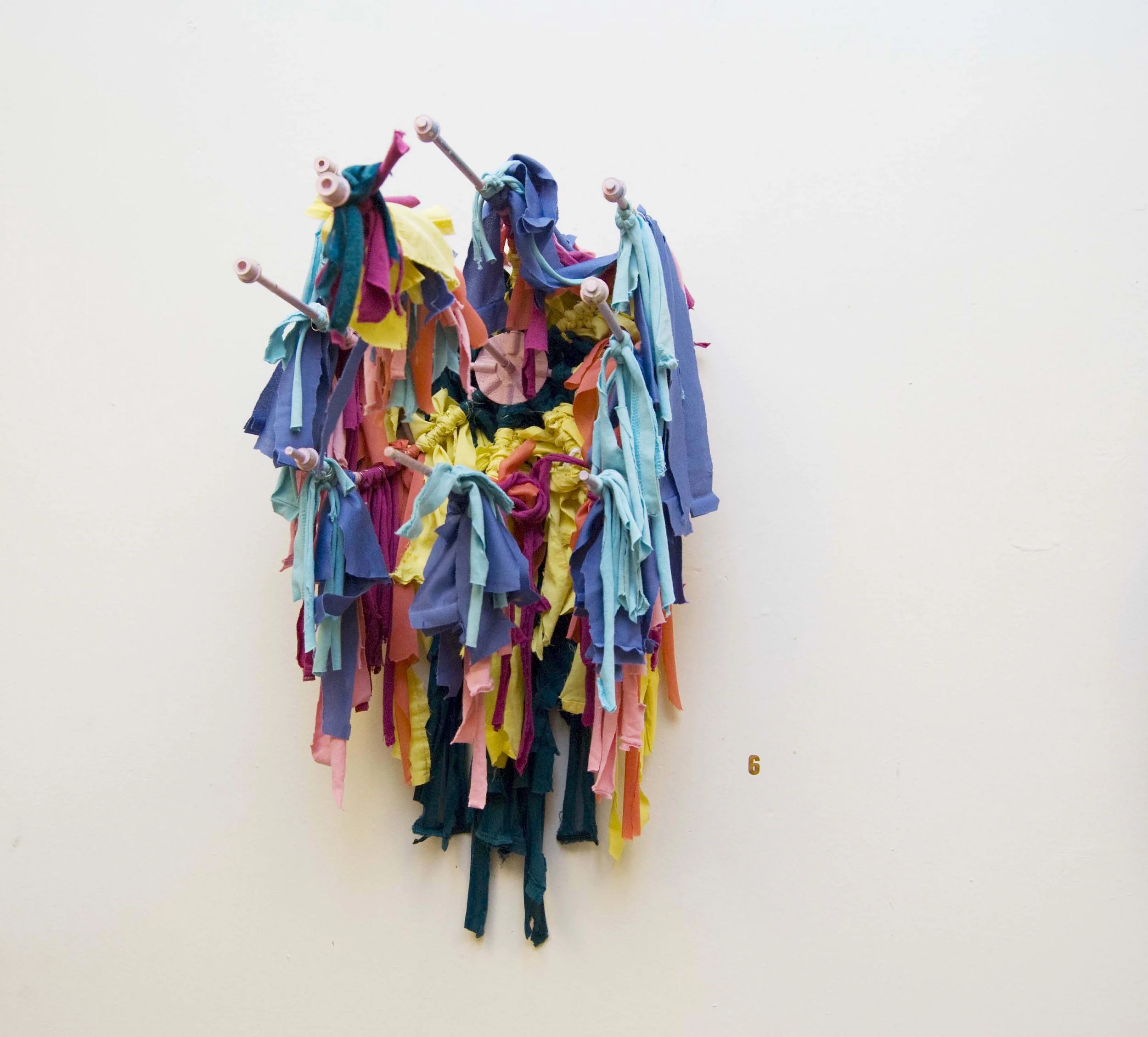 I aim to visually convey these specific social dynamics by symbolically weaving the colored materials and items through the metal forms. This is done as an attempt to visually transcend the implied social boundaries that the fences and grids represent. Conversely, I use these metal items as bases because they’re elementally sound and solid. Additionally, some of the works also have chicken wire arranged around the base metal object then the entire form has to be molded into a desired shape. Overall, my intention is to create works that attempt to visually parallel the social and gender inequalities that are manifested in our world due to the imbalances of feminine and masculine energies.