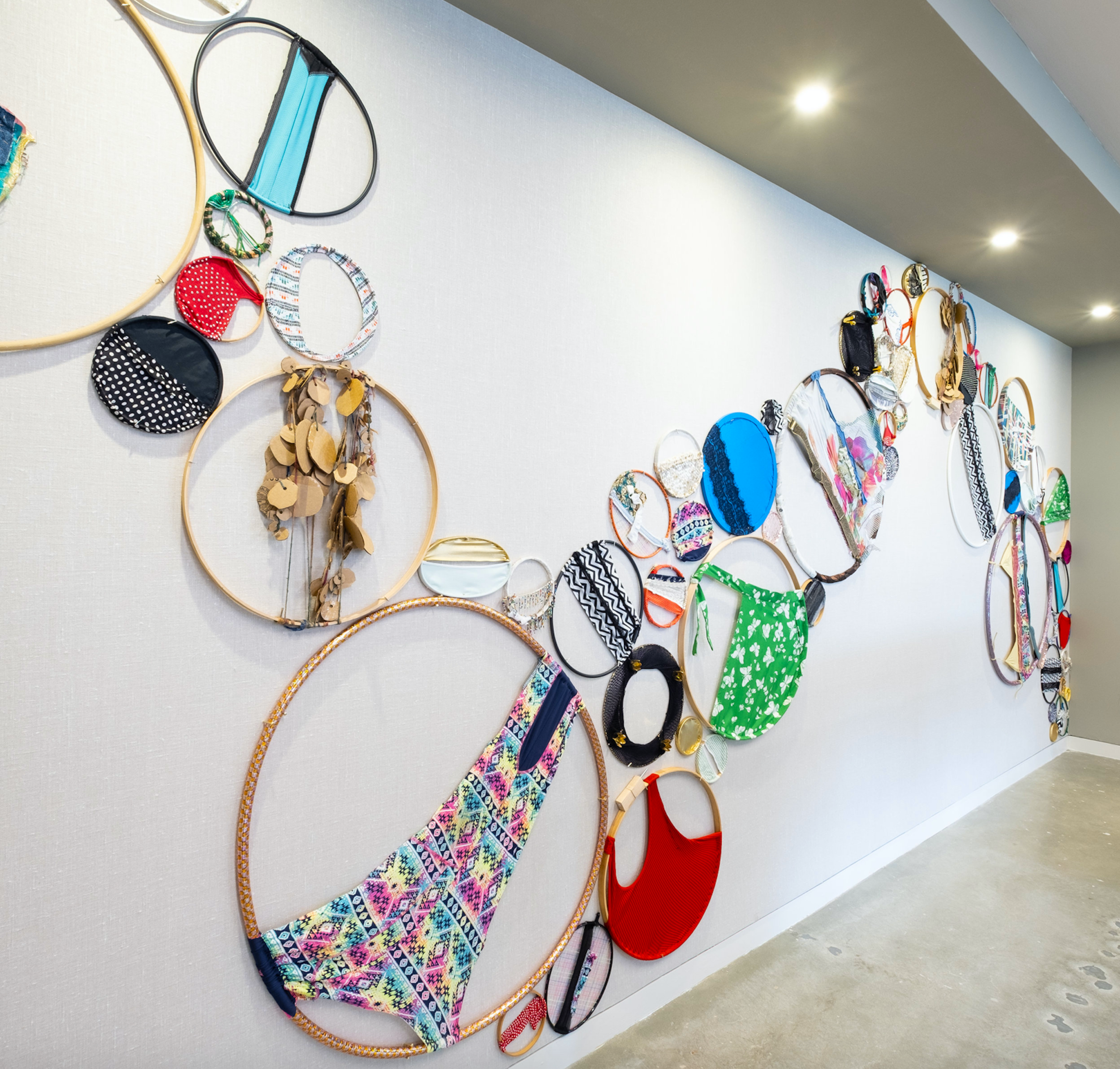 This particular iteration of the installation was commissioned by a DC corporation as part of their private art collection. This version includes 76 hand sewn circular forms mixed media on wood, plastic, and wire various sized, sewn, or woven circles.